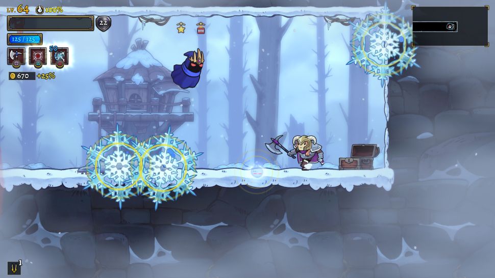 Each level has its own striking visual style. Things start off in a traditional castle setting, while later levels see you explore beautiful snow-covered surroundings and an enchanting study filled with magical platforms. Threatening you along your journey is a relentless horde of enemies. These come in as many shapes and sizes as you do. Some fill the screen with deadly projectiles, while others want nothing more than to whack you on the head with a powerful melee strike.